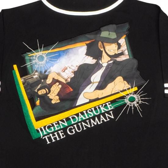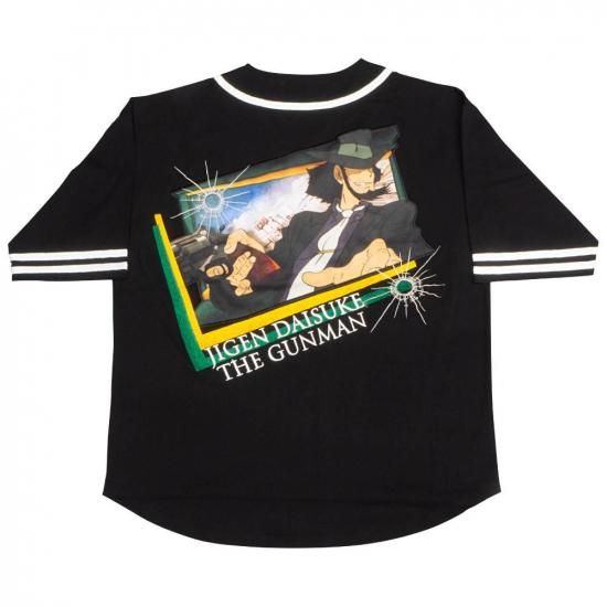 ルパン三世PART4のオープニングカットに登場する次元大介を、迫力あるプリントと刺繍でデザインしたベースボールシャツ。